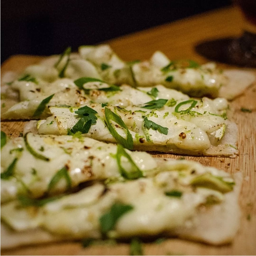 ⭐ Abobrinha flatbread (massa fina coberta com requeijão cremoso, fatias de abobrinha, queijo branco maçaricado, tomilho, salsa, raspas de limão e azeite) – R$ 30