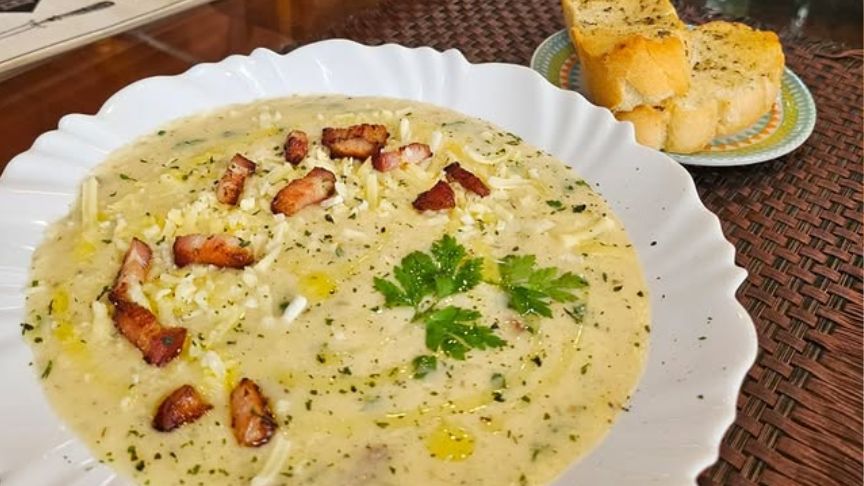 Outra sugestão deliciosa é o creme de batata com cebola, alho, alecrim, tomilho, salsa, catupiry, creme culinário e parmesão, finalizado com queijo coalho ou bacon.