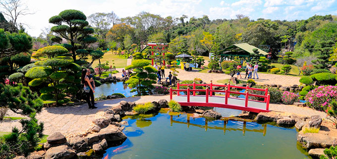 O belíssimo jardim japonês é considerado o maior do país e conta com um primoroso projeto de paisagismo, espelhos d’água com carpas orientais, bonsais, ponte japonesa e cascatas.