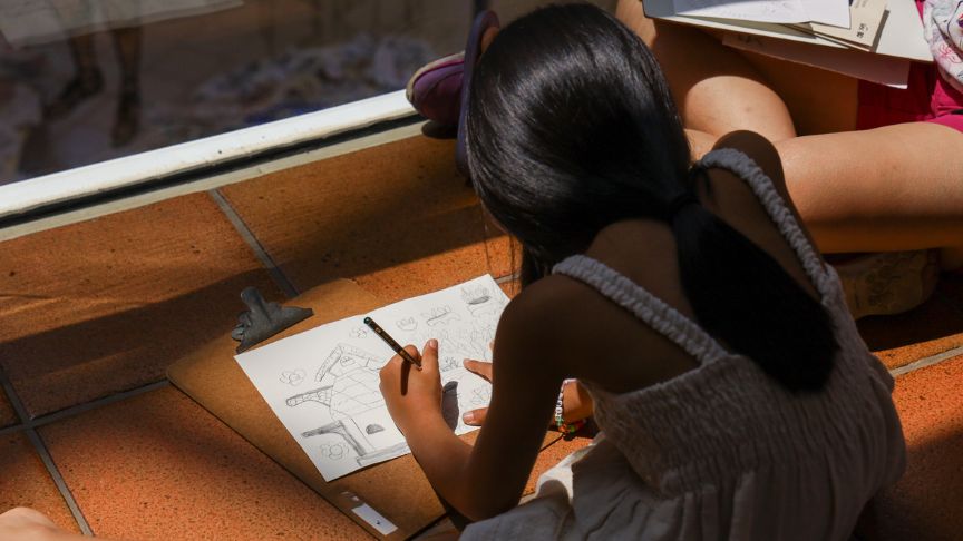 Nesta proposta, as crianças, acompanhadas de seus responsáveis, caminham ao redor do Sesc Sorocaba, utilizando pranchetas para observar atentamente o entorno.