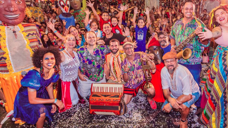 Além da música, também há um grupo de brincantes que convida o público a curtir cortejos e danças coletivas e a acompanhar a manipulação de bonecos que representam alguns dos homenageados.