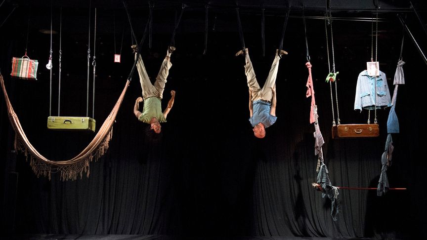 Às 20h, a companhia apresenta o espetáculo “Homens com Solas de Vento”, no qual dois viajantes prestes a embarcar ficam retidos em uma aduana, sem poder seguir em frente.